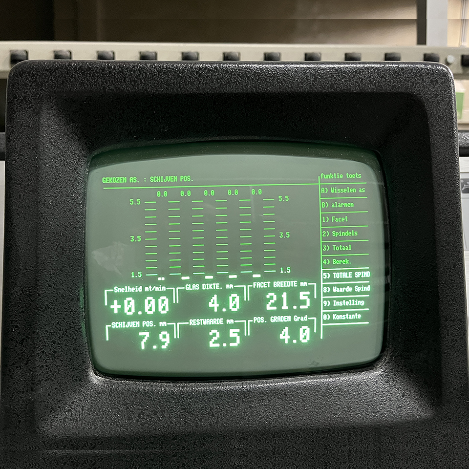 Machine is ingekocht omdat onzer klant is gestopt met zijn bedrijf wegens persoonlijke reden. De facetmachine is door mijn klant destijds nieuw aangekocht en is dan ook spreekwoordelijk 1e eigenaar. De facet machine B73CN verkeerd in een top conditie. In total slecht 36000 mtr geslepen. Voor deze professionele machine is dit net in gelopen. De machine heeft altijd op tijd zijn service beurten gehad. Uitlevering zal geschieden in overleg, en met een nieuwe set schijven bijgeleverd.